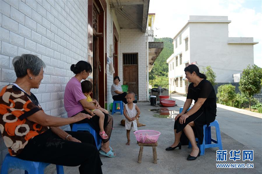 6月29日,眭玲艳(右)在新田县龙泉镇小岗村与村民交流。 新华社发(陈振海 摄)