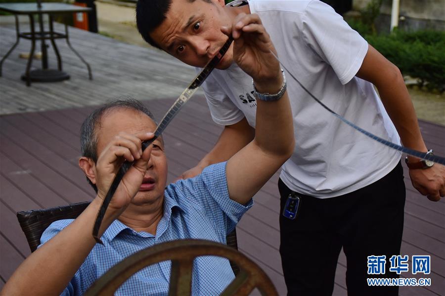 6月30日,朱生荣(左)和儿子朱强(右)在当晚电影开播前检查胶片位置。新华社记者 郑梦雨 摄