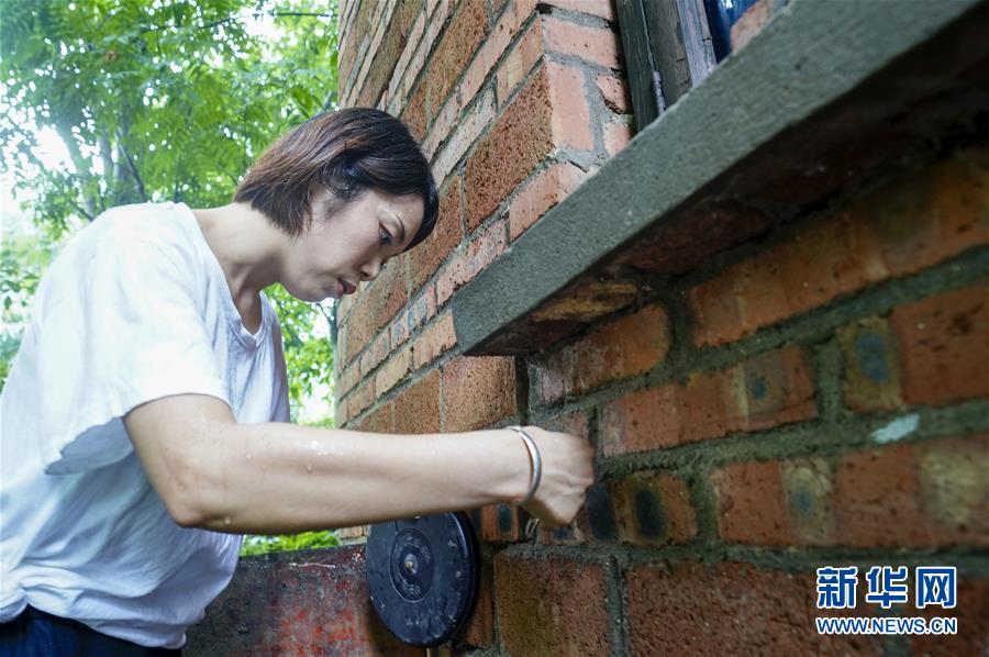 7月1日,地质灾害监测员侯芳对一处农房的墙上裂缝宽度进行测量。 新华社记者 刘潺 摄