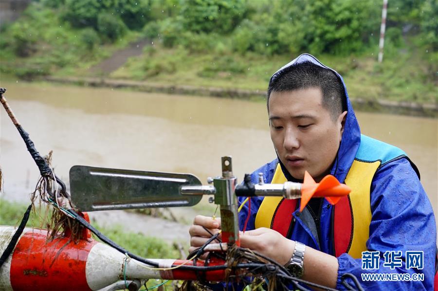 7月1日,在永川区临江河来苏水文站,站长钟睿在安装调试流速仪。新华社记者 刘潺 摄