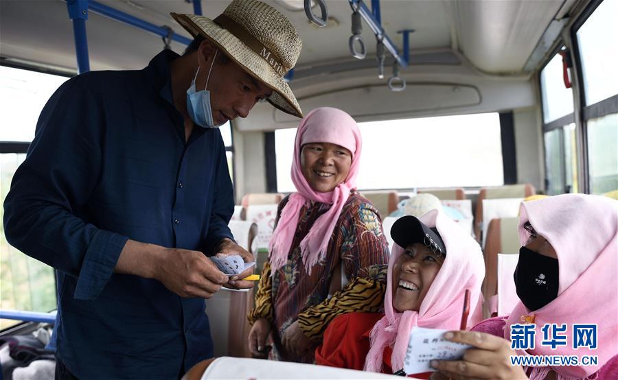 一位劳务经纪人(左)在为采摘工登记采摘斤数(6月30日摄)。新华社记者 杨植森 摄