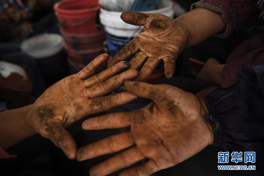 采摘工沾满枸杞鲜果和叶片汁液的手(6月30日摄)。新华社记者 冯开华 摄