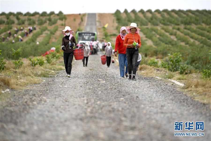 在宁夏中宁县玺赞生态枸杞庄园,采摘工准备去吃午饭(6月30日摄)。新华社记者 冯开华 摄
