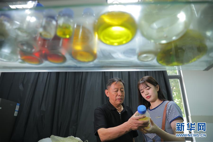 7月1日,在江苏省江阴市郑金良创办的“长江三鲜”繁育与养殖研发基地的实验室内,郑金良和孙女郑冰清对瓶内鱼标本进行讨论。新华社记者李雨泽摄