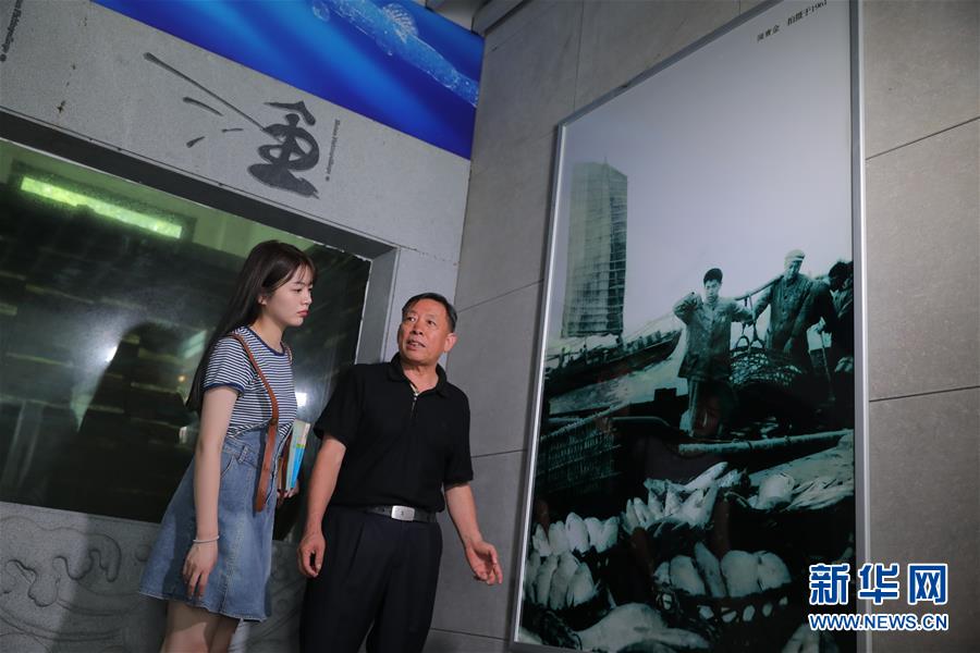 7月1日,在江苏省江阴市长江珍稀鱼类科普馆,郑金良给孙女郑冰清讲述老照片中的长江故事。新华社发(刘浏 摄)