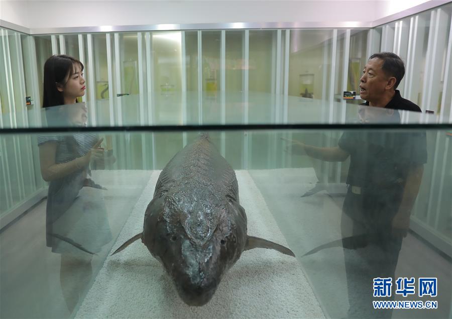 7月1日,在位于江苏省江阴市的长江珍稀鱼类科普馆内的中华鲟标本前,郑冰清听爷爷郑金良讲述关于保护中华鲟的知识。新华社记者李雨泽摄