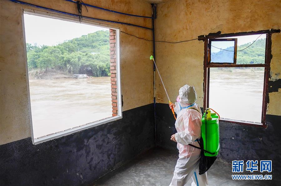 7月2日,重庆市江津区广兴镇时化街社区的一名工作人员在对一栋被洪水侵袭后的居民楼进行消毒作业。 新华社记者 刘潺 摄