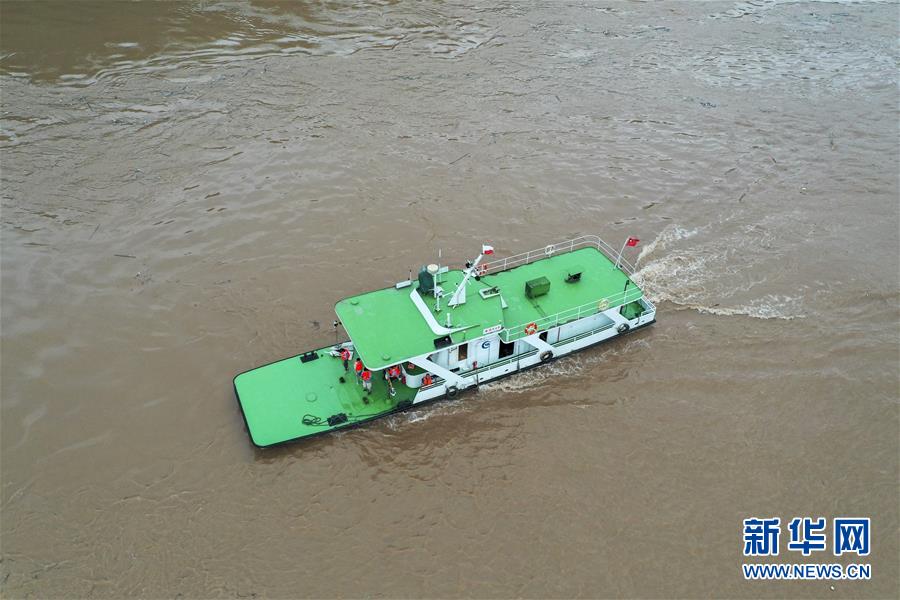 7月2日,长江清溪场水文站的监测船在长江上开展测量作业(无人机照片)。 新华社记者 刘潺 摄