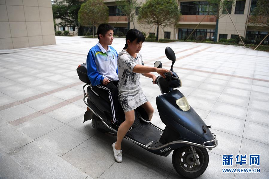 在广德中学,妈妈刘香骑车带着程东东离开教室回宿舍吃午饭(5月28日摄)。 新华社记者刘军喜摄