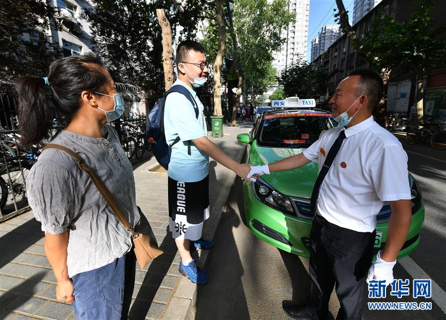 7月7日,刘德海(右)将一名考生送至考点后向考生送上祝福。新华社记者 张博文 摄