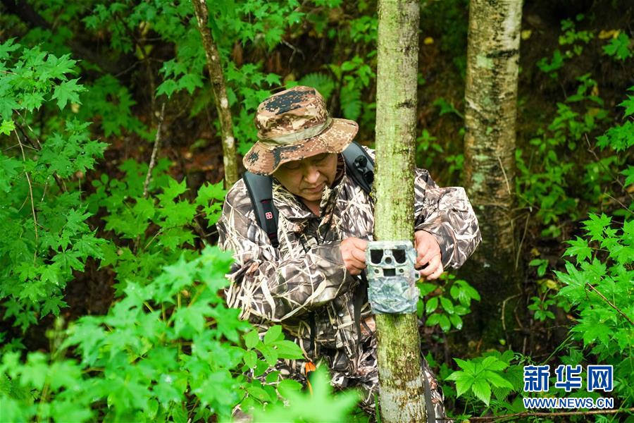 董红雨在迎春林业局有限公司施业区内查看架设在树上用于拍摄野生东北虎踪迹的远红外相机(7月8日摄)。新华社记者 王松 摄