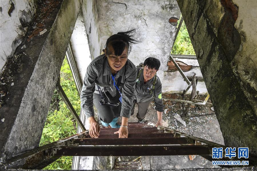 7月9日,在龙道山护林点,黄通甫与妻子黄日秀准备爬上瞭望台顶进行观测。新华社记者 曹祎铭 摄