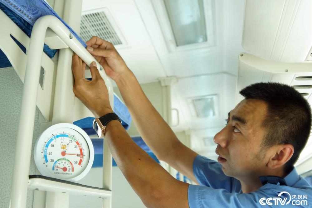 央视网消息:7月8日,在内蒙古额济纳火车站,列车员韩东峰正在高温下对卧铺车厢的卧具进行整理。