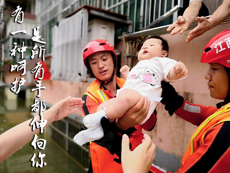 7月9日15时,江西省景德镇市茶山路有一名女子带着7个月大的婴儿,已被困3天,家中“弹尽粮绝”。消防员到达现场后,从窗户口接力将婴儿抱出,婴儿露出呆萌的表情。新华网发 汪艺群 摄