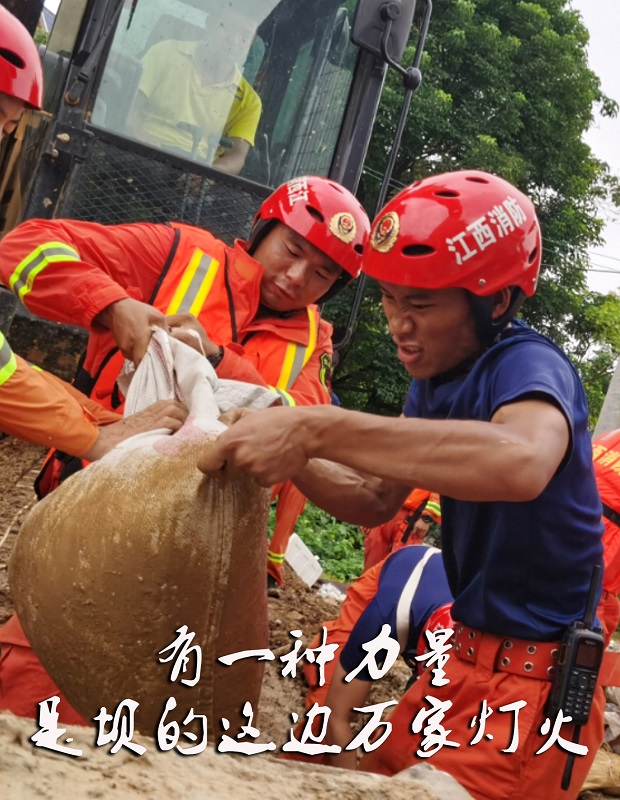 7月9日18时42分,江西省鄱阳县古县渡镇堤坝出现缺口,水势凶猛。接到处置任务的新余市消防救援人员争分夺秒装填沙袋,堵住了缺口。这次任务,他们累计填装沙袋3000余个,搬运的沙袋重量超过30吨。新华网发 敖昊 摄