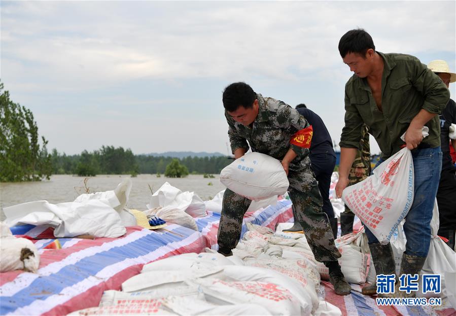7月12日,江洲镇柳州村的村支书洪棉雪(左)组织村民在堤坝上构筑新的子堤。新华社记者 彭昭之 摄