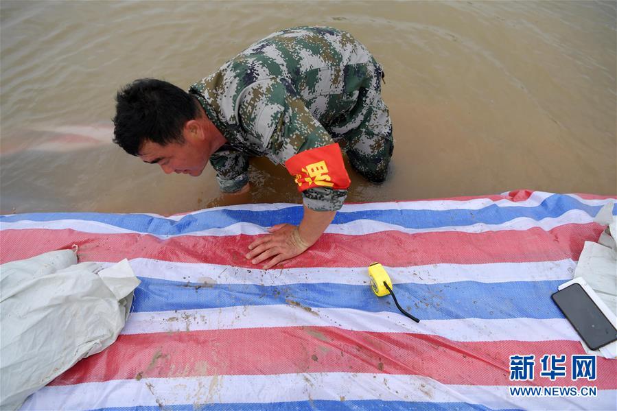 7月12日,江洲镇柳州村的村支书洪棉雪在探查堤坝底部的情况。新华社记者 彭昭之 摄