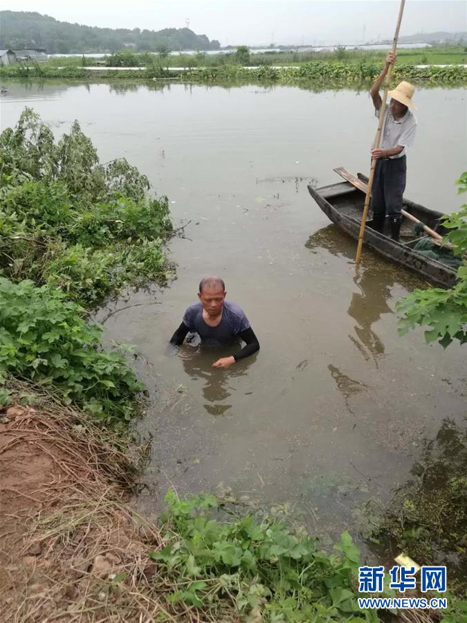7月10日,张贵来(左)在填堵老泊圩圩堤漏洞。 新华社发