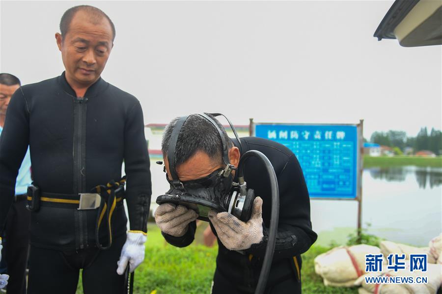 徐庆九(右)进入岳阳华容县华容河一处有险情的涵闸作业前测试氧气面罩(7月13日摄)。新华社记者 陈泽国 摄