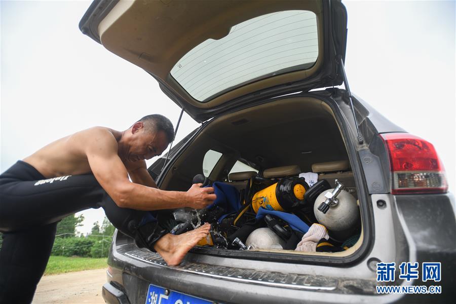 在岳阳华容县藕池河旁,徐庆九(右)潜水排险作业后换下潜水服(7月13日摄)。新华社记者 陈泽国 摄