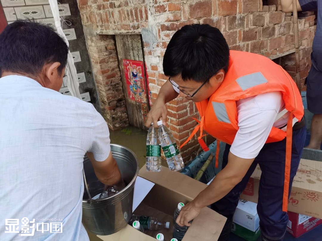 经过一个多小时紧急救助,1000余名群众被安全转移到地势较高的地方,全村无人员伤亡。图为余鑫和村干部乘船通过吊桶帮助深水区村民运送生活物资。新华网发 受访者供图