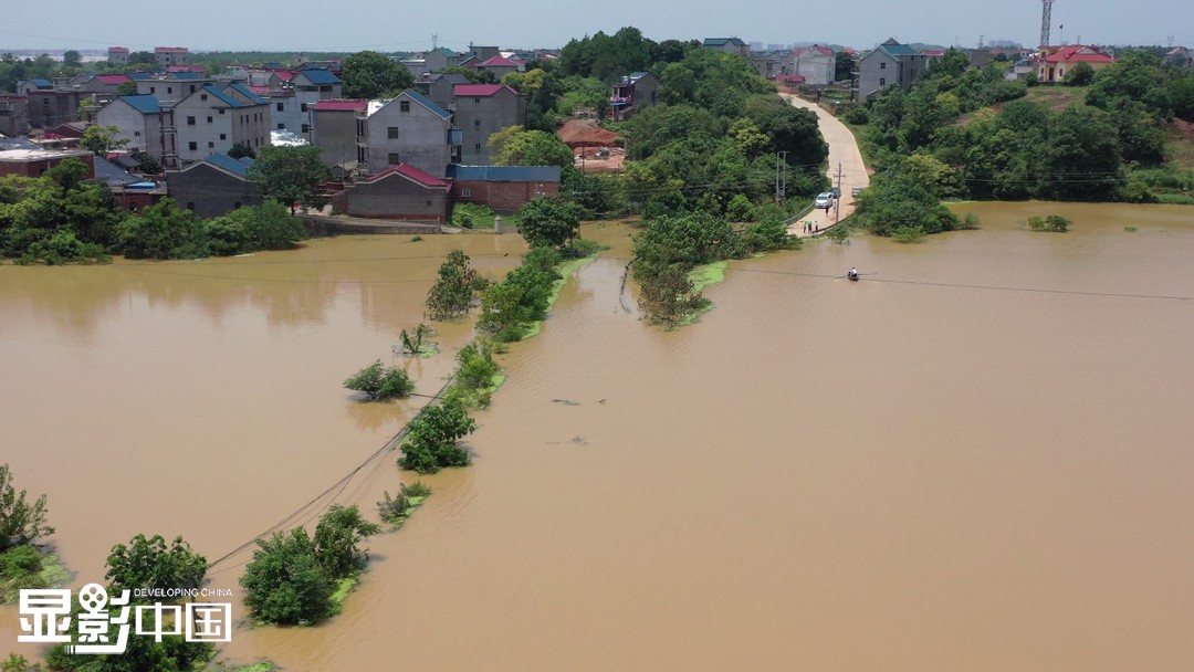 到7月9日,距离决堤口直线距离不到2公里的道汊村部分粮田、低洼地带的540多户村民房屋被淹,通讯电力中断,通往县城的两条主要道路也相继中断,村里4千多人被困,救灾物资无法直接运抵。图为村子通往外界的主要道路被淹画面。新华网 王凯丰摄
