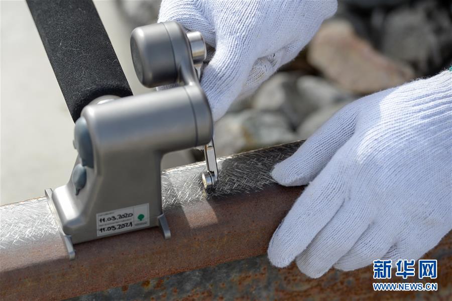 技术员用仪器进行钢轨廓形检测(7月14日摄)。新华社记者 丁磊 摄