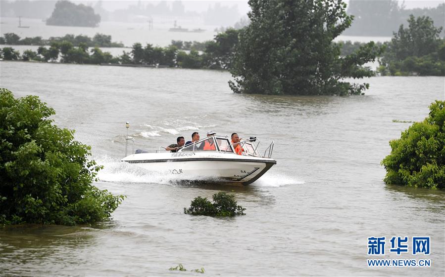 7月15日,宿松县洲头乡泗洲村村民在宿松蓝天救援队的协助下从家里取出物品后返回大堤。新华社记者 刘军喜 摄