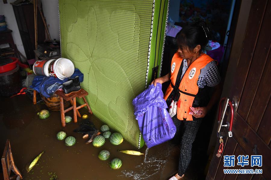 7月15日,宿松县汇口镇三洲村村民黄付美在宿松蓝天救援队的协助下返回家里取出落下的重要物品。新华社记者 刘军喜 摄