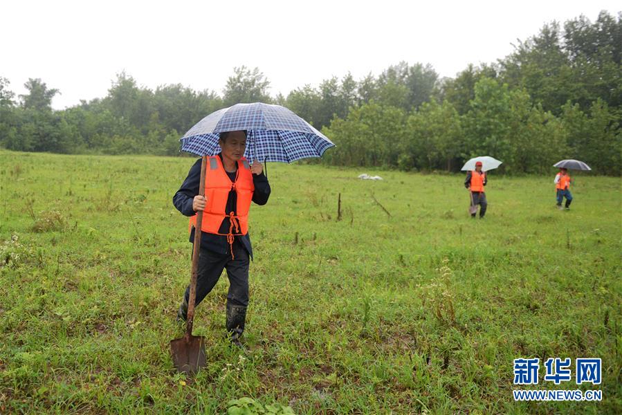 7月16日,铁铜乡新丰村的抗洪抢险队员鲍大友(左)和队友在圩堤上巡堤查险。 受长江持续高水位影响,安徽省枞阳县的铁铜乡江心洲已于近日将江心洲上的居民转移安置,而包括抢险队员、乡镇干部、水利工程师等在内的近300人“留守”在江心洲上巡堤查险,守护家园。铁铜乡位于长江江心洲上,有4个行政村52个村民组,耕地面积12000多亩。 新华社记者 黄博涵 摄