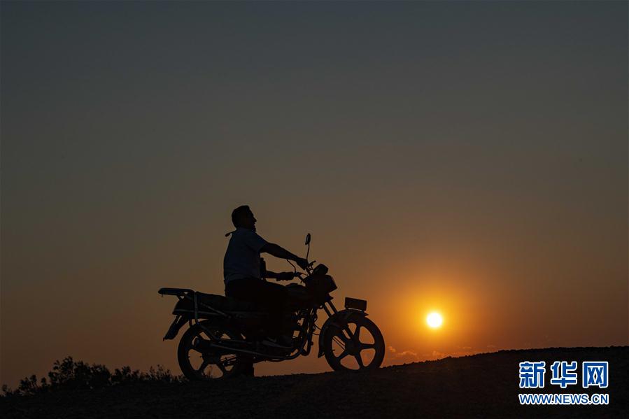 夕阳西下,新疆艾比湖湿地国家级自然保护区的生态管护员帕勒哈提完成一天的工作后,骑车驶回管护站(7月13日摄)。 新华社记者 胡虎虎 摄
