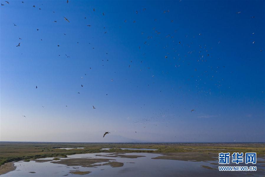 新疆艾比湖湿地国家级自然保护区内鸥鸟翔集(7月14日摄,无人机照片)。 新华社记者 胡虎虎 摄