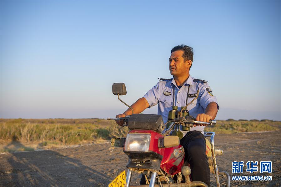 生态管护员帕勒哈提在新疆艾比湖湿地国家级自然保护区内巡护(7月13日摄)。 新华社记者 胡虎虎 摄