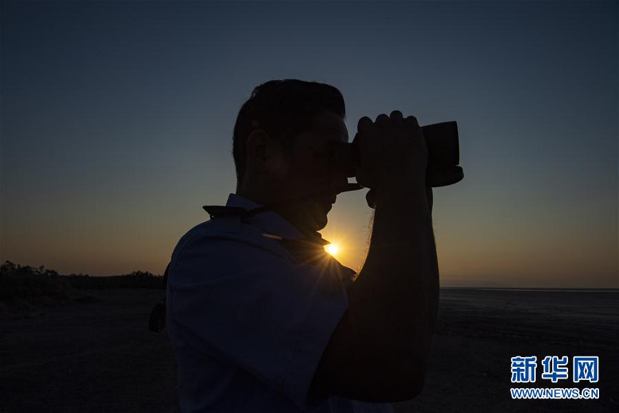 在艾比湖畔,生态管护员帕勒哈提用望远镜观察湖面鸥鸟的活动情况(7月13日摄)。新疆艾比湖湿地国家级自然保护区是诸多珍稀鸟类的栖息地和迁徙中转站。 新华社记者 胡虎虎 摄