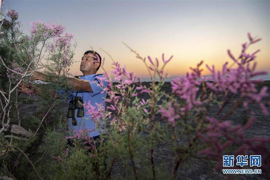 巡护途中,新疆艾比湖湿地国家级自然保护区的生态管护员帕勒哈提在检查保护区内一处红柳的生长情况,查看是否有虫害(7月13日摄)。 新华社记者 胡虎虎 摄