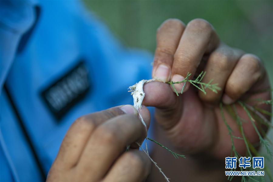 巡护途中,新疆艾比湖湿地国家级自然保护区的生态管护员帕勒哈提在保护区内查看红柳上的虫卵(7月13日摄)。 新华社记者 胡虎虎 摄