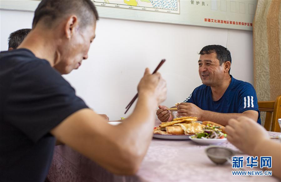 巡护归来,生态管护员帕勒哈提和同伴在新疆艾比湖湿地国家级自然保护区内的一处管护站吃早餐(7月14日摄)。夏季高温,为避免中暑,早上的巡护一般在天刚亮就出发。 新华社记者 胡虎虎 摄