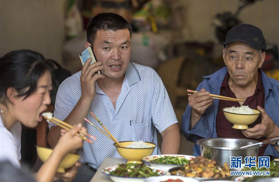 7月16日,韩宝成(中)在家里刚端上饭碗,就有人从渡口打来电话要乘船渡江。 新华社记者 陶明 摄