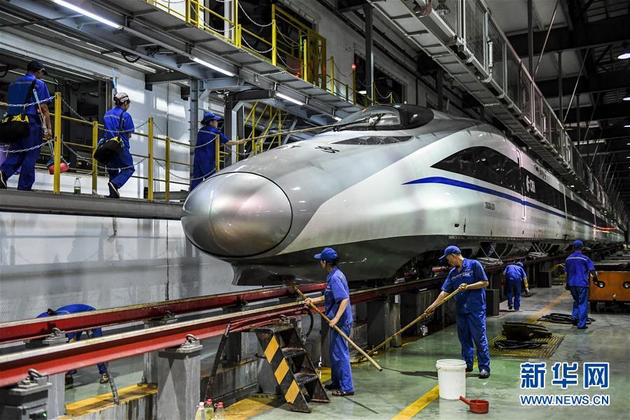 在南宁动车所检修库,工作人员对车体外表进行清洁(7月17日摄)。 暑运期间,中国铁路南宁局集团有限公司南宁车辆段的工作人员加大对高铁、动车的检修保养力度,确保车辆运行安全。 新华社记者 曹祎铭 摄