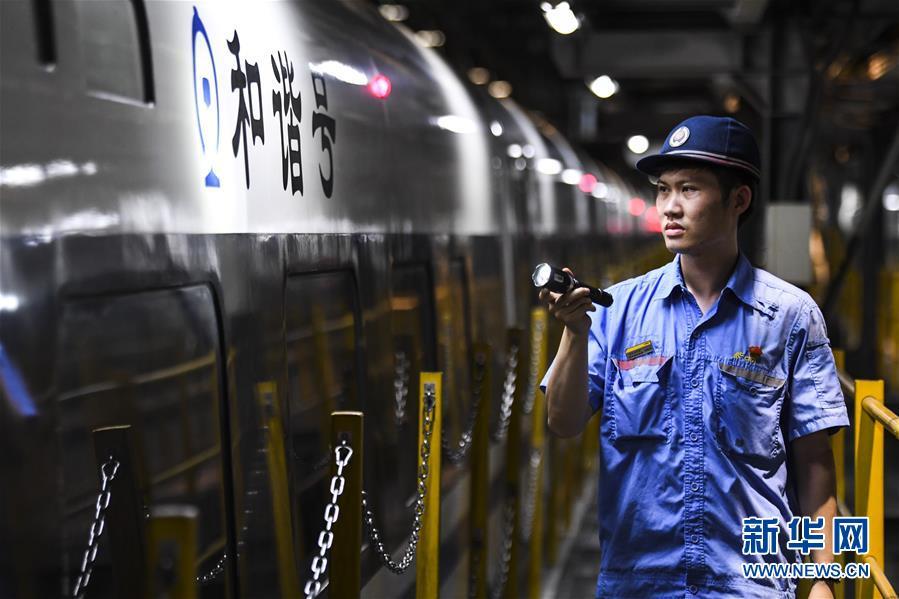 在南宁动车所检修库,地勤机械师对车体外表进行检查(7月17日摄)。 暑运期间,中国铁路南宁局集团有限公司南宁车辆段的工作人员加大对高铁、动车的检修保养力度,确保车辆运行安全。 新华社记者 曹祎铭 摄