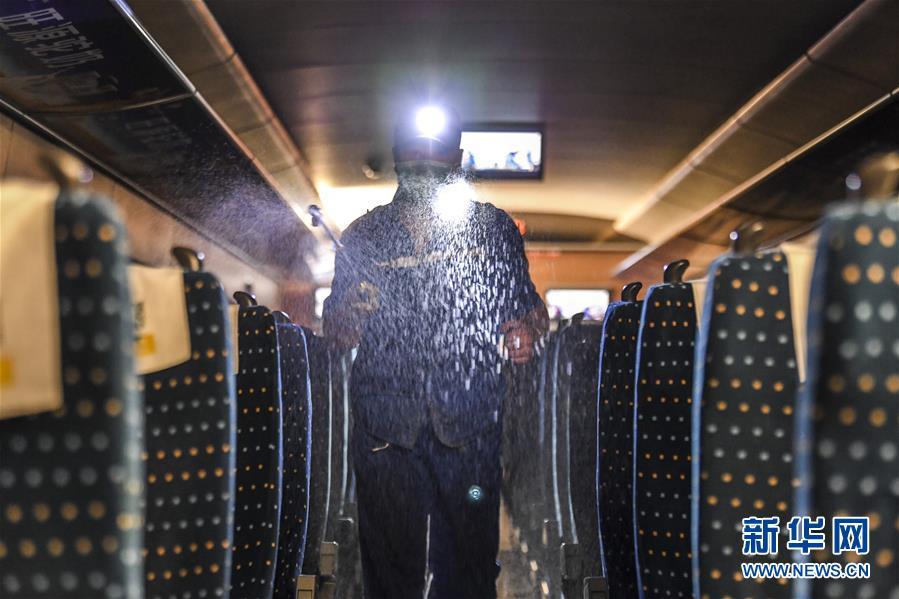 在南宁动车所检修库,工作人员在车厢内进行消毒(7月17日摄)。 暑运期间,中国铁路南宁局集团有限公司南宁车辆段的工作人员加大对高铁、动车的检修保养力度,确保车辆运行安全。 新华社记者 曹祎铭 摄