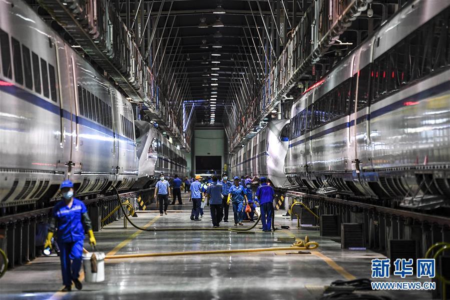 忙碌的南宁动车所检修库(7月17日摄)。 暑运期间,中国铁路南宁局集团有限公司南宁车辆段的工作人员加大对高铁、动车的检修保养力度,确保车辆运行安全。 新华社记者 曹祎铭 摄