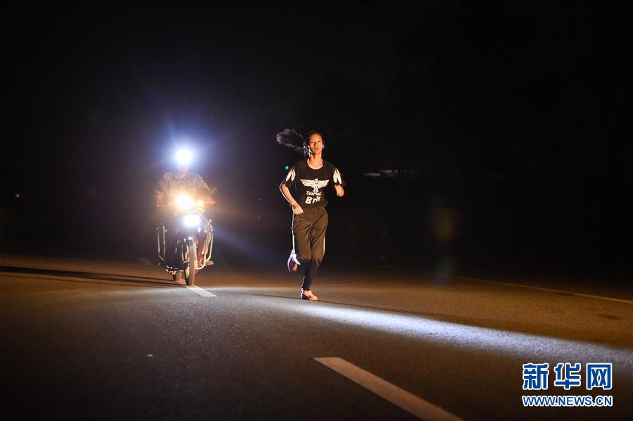 7月8日凌晨,郑国花(右)在父亲的陪伴下晨跑。新华社记者 刘磊 摄