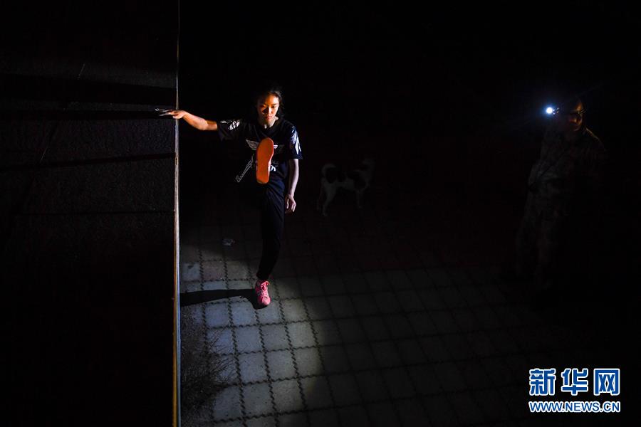 7月8日凌晨,郑国花(左)在晨跑结束后进行放松练习,一旁的父亲为她照明。新华社记者 刘磊 摄