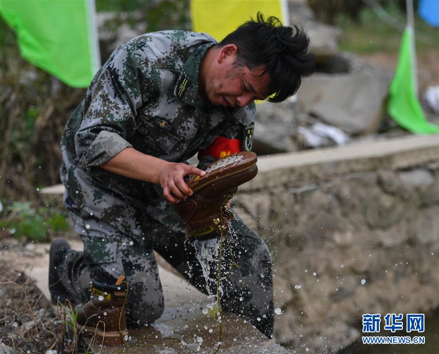 7月18日,陈健处理完险情后,将鞋内的水倒出。新华社记者 胡晨欢摄
