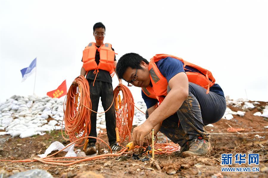 7月21日,东华理工大学地球物理与测控技术学院博士周聪(右)、武超峰在芙蓉河内堤上布设三维电阻率成像系统的电缆。 新华社记者 李鑫 摄