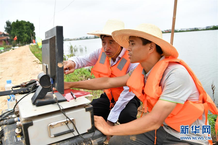 7月21日,东华理工大学地球物理与测控技术学院教授邓居智(左)和博士周峰在分析探地雷达数据。新华社记者 李鑫 摄