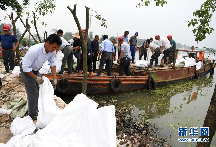 7月21日,在和县乌江镇石跋河新圩段,救援人员在装运抢险物资。受洪水影响,安徽省和县乌江镇石跋河新圩段出现100多米的堤坝滑坡、塌方险情。因出现险情一侧堤坝无道路可通行,抢险所用的砂石、木料等物资需要从石跋河对岸“摆渡”过来。救援抢险人员携手“接力”转运抗洪物资,共同奋战2天,成功排除险情。新华社记者 刘军喜 摄