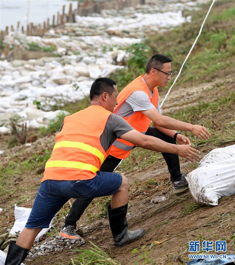 7月21日,在和县乌江镇石跋河新圩段,救援人员在处理险情。受洪水影响,安徽省和县乌江镇石跋河新圩段出现100多米的堤坝滑坡、塌方险情。因出现险情一侧堤坝无道路可通行,抢险所用的砂石、木料等物资需要从石跋河对岸“摆渡”过来。救援抢险人员携手“接力”转运抗洪物资,共同奋战2天,成功排除险情。新华社记者 刘军喜 摄