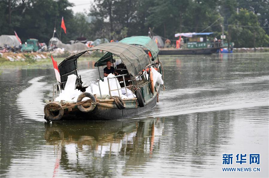7月21日,在和县乌江镇石跋河新圩段,救援人员在运送抢险物资。受洪水影响,安徽省和县乌江镇石跋河新圩段出现100多米的堤坝滑坡、塌方险情。因出现险情一侧堤坝无道路可通行,抢险所用的砂石、木料等物资需要从石跋河对岸“摆渡”过来。救援抢险人员携手“接力”转运抗洪物资,共同奋战2天,成功排除险情。新华社记者 刘军喜 摄